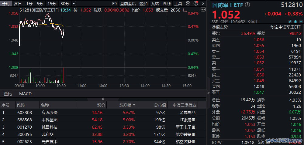 场内热门ETF方面,国防军工ETF(512810)红盘震荡,盘中一度涨近1%,截至发文回落至水面上方。