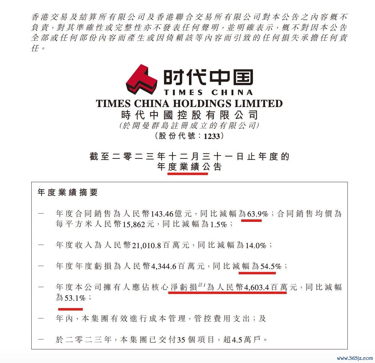 天天房产3月28日讯,时代中国控股有限公司(时代中国控股,1233.HK)发布截至2023年12月31日止年度业绩公告,提及2023年度亏损收窄至43.45亿元,同比减幅54.5%。