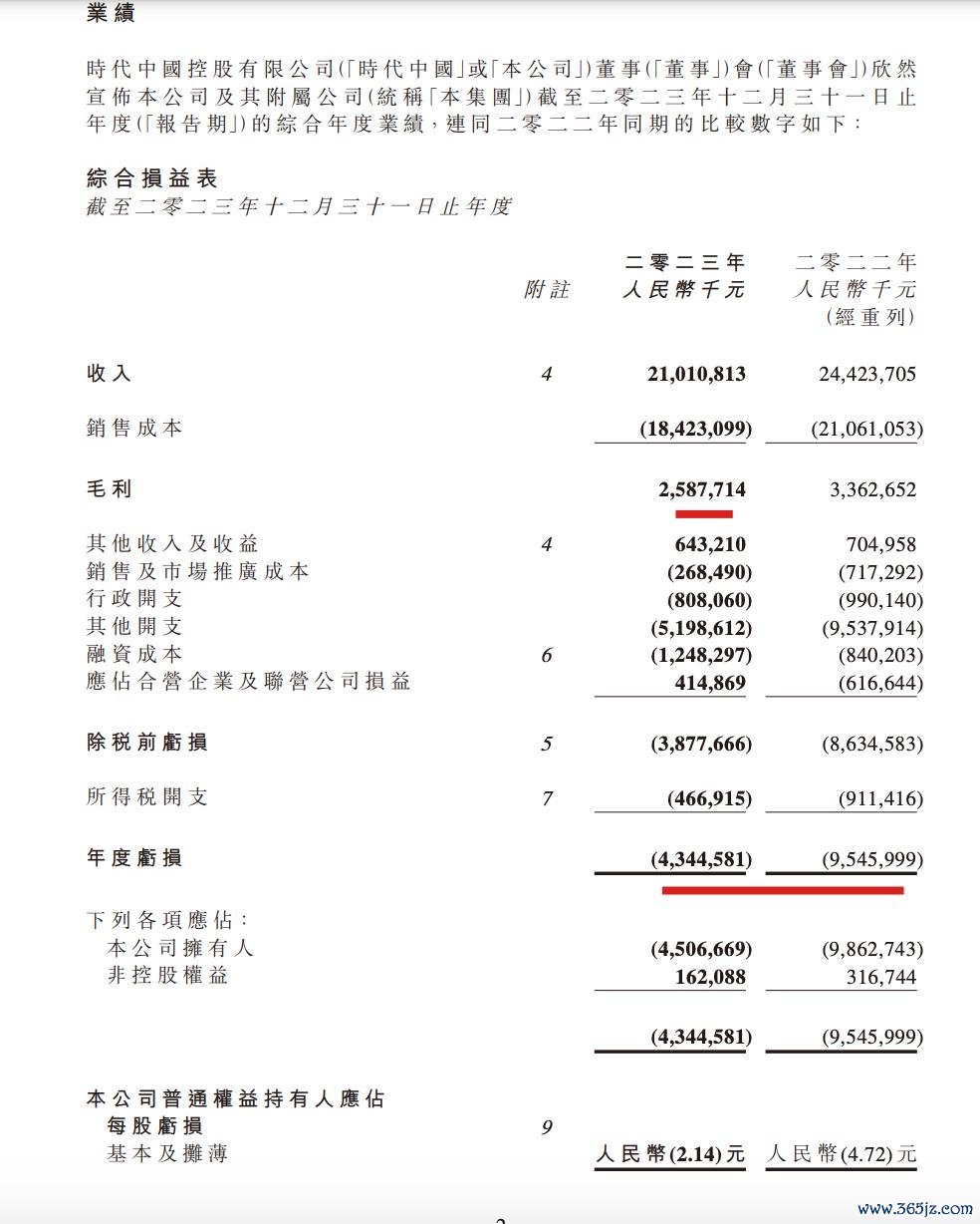 公告披露,报告期内,时代中国控股录得年度收入为人民币210.11亿元,同比减幅为14.0%;毛利为25.88亿元,减幅为23%。年度亏损为人民币43.45亿元,同比减幅为54.5%;公司拥有人应占核心净亏损为人民币46.03亿元,同比减幅为53.1%。基本及摊薄每股亏损为2.14元。