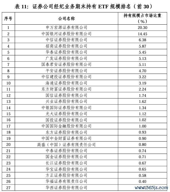 截至三月底,券商经纪业务持有ETF规模排名中,申万宏源证券和中国银河证券持有ETF规模的占比分别为20.3%、14.45%,遥遥领先其他券商,且两者合计市场份额为34.75%。