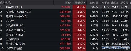 该基金紧密跟踪纳斯达克100指数(NDX.GI),指数隔夜收涨1.6%。成份股中,TRADEDESK上涨4.13%,铿腾电子上涨3.58%,超威半导体、英伟达等个股跟涨超3%。