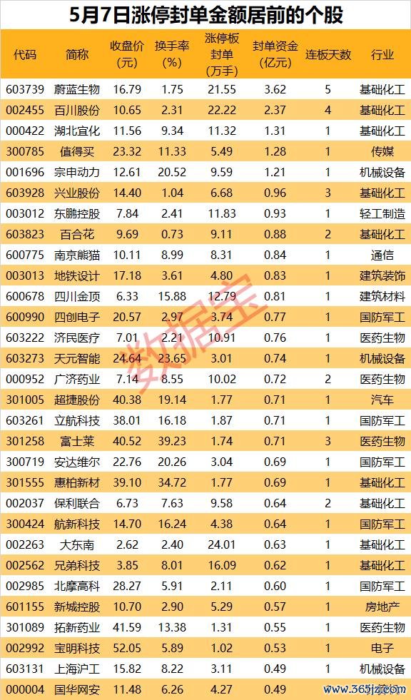 以封单金额计算,5股封单金额超亿元,蔚蓝生物(603739)、百川股份、湖北宜化封单金额分别为3.62亿元、2.37亿元、1.31亿元。