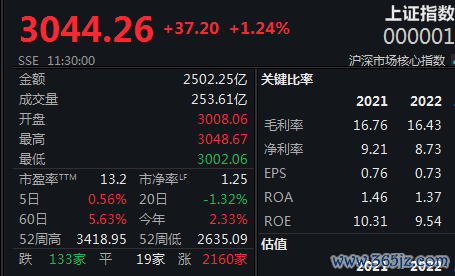 昨日盘后,高层发声解读政策配资杠杆开户,今日微盘股出现明显反弹。截至上午收盘,上证指数涨1.24%报3044.26点,深证成指涨1.54%,创业板指涨1.34%,北证50涨3.66%。A股半日成交5734.6亿元,北向资金小幅净卖出0.18亿元。